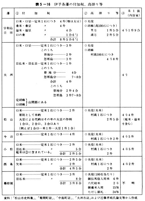 表5-16 伊予各藩の付加税、高掛り等
