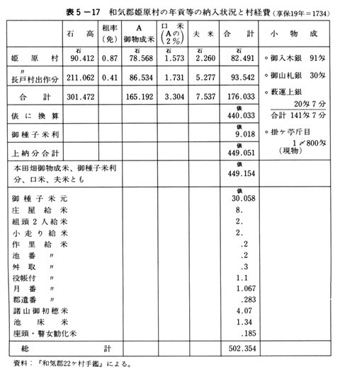 表5-17 和気郡姫原村の年貢等の納入状況と村経費