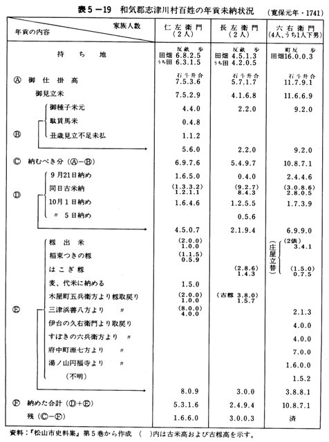 表5-19 和気郡志津川村百姓の年貢未納状況