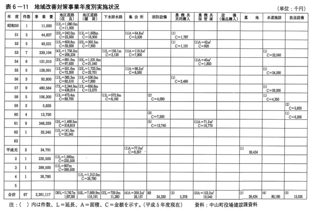 地域改善対策事業は国及び地方公共団体が同和地区に対して、実態的差別の解消を図るために行う事業である。 すなわち、対象地域における生活環境の改善、社会福祉の推進、教育の充実及び産業の振興等を行うことによって対象地域住民の社会的、経済的地位の向上を図るものである。 本町では、すべての町民が本事業の主旨を理解し、相互に基本的人権を尊重する中で、右の目的を達成するため表6―11のとおりこの事業を推進してきた。