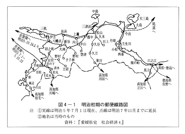 明治五年、郵便の全国実施が行われた。明治初期の郵便路線図を見ると、本県は、石鉄県管内が川之江・関の峠・西条・今治・松山、宇和島県管内は郡中・中山・内子・大洲・八幡浜・卯之町・吉田・宇和島に郵便取扱所が設けられ、また明治七年には、県内各地で支線の整備が進み中山―惣津も開設された。