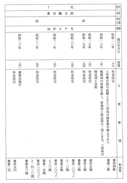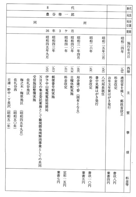 四代目飛田吉一局長は、昭和六三年三月三一日在職三九年九ヶ月余で退職し、五代目は中山郵便局長小笠原吉夫が兼務したが、同年五月九日六代局長亀井愼滋が就任し現在に至っている。