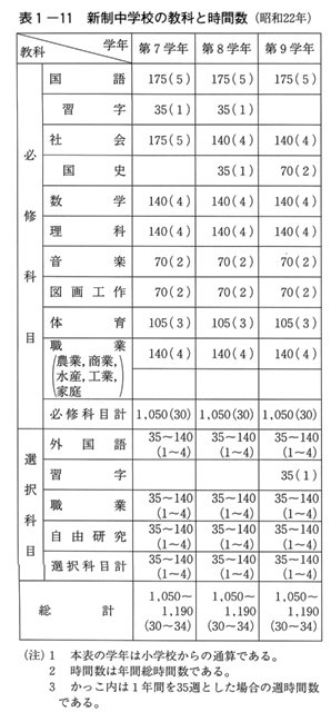 表1-11 新制中学校の教科と時間数(昭和22年)