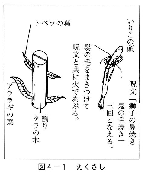 鬼除けのために、タラの木にトベラとアララギの葉をはさんだものと、鰯の頭に女の髪の毛を結びつけて焼いた物を、家の重要な入り口に立てる。囲炉裏のある家では自在鈎につける。