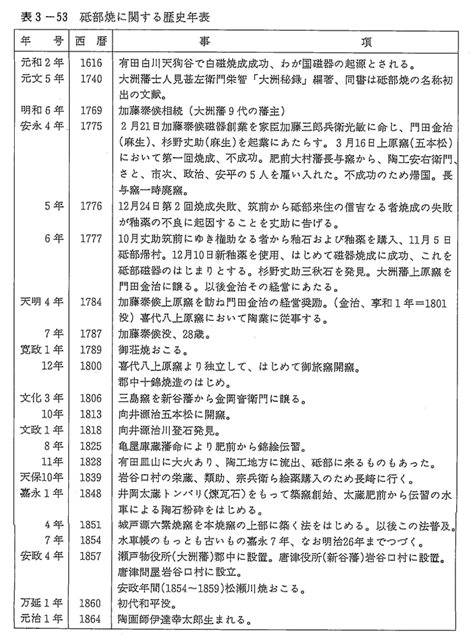 「砥部焼」という呼び方が初めて出てくる文献は、大洲藩士人見甚左衛門栄智が元文五年(一七四〇)に筆写した『大洲秘録』である。この書物の中に、砥部の大南村と北川毛村の特産物をあげ、「陶茶碗之類ヲ造リ出ストベヤキト云」、「陶器茶碗鉢類トベヤキト云」とあり、このころよりも前に砥部では陶器(土物)が生産され、特産物として有名だった(表3-53)。