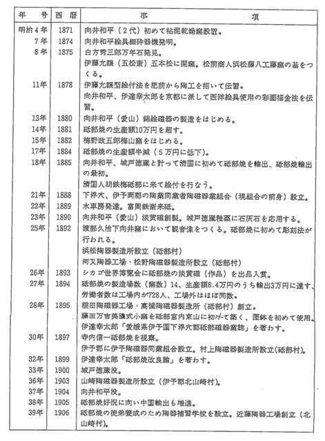 源治・庫蔵以後なお幾多の先覚者が出て技術上の工夫・改良を加え次第に発達したが、明治に入り向井和平(源治の孫)、伊藤允譲・城戸徳蔵が出るに及んで砥部焼はその品位を高め、内外にその名声を博するに至った。すなわち、和平は幾多の製造上の改良をなしたほか、明治一一年(一八七八)伊達幸太郎を京都に派遣して彩画描金の法を伝習せしめ、一三年より西洋絵具を用いる京都風(清水焼)絵付の製品をつくり、一八年には城戸徳蔵等と共に海外輸出品の製造を始め、さらに二三年には新たに淡黄磁器を創製して内外に好評を博し、二五年には磁器に彫刻を施して製品に改良を加えた。また、伊藤允譲(五松斎)は明治一一年(一八七八)に有田から工匠を招いて型絵・染付の法を伝え、自らも錦手と称して青華錦彩の精巧美麗なものを製造した。城戸徳蔵は、向井和平と輸出品の製造を始めた(写真3-25)。