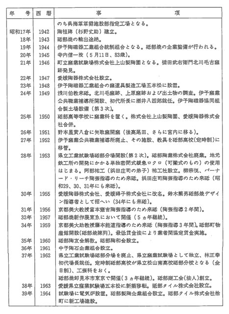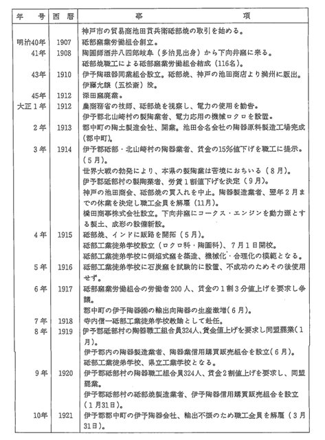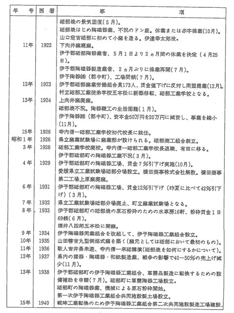 昭和になっても好転はみられず低迷が続いた。その中で、一三年に組合の共同製土工場がつくられ、それまで多くあった水車に代わって機械で陶石を砕き、坏土をつくるようになった。第二次大戦中は企業統制により、当時の伊予陶磁器工業組合所属の一五工場は四工場に統合せられた。戦後は、東南アジア向けの伊予ボールの生産で復興した。二八年ころからは国内向け花器・置物・飲食器などの生産に力を入れるようになった。また三〇年には碍子、三八年には工芸タイルの生産も始まり、四〇年代には民芸ブーム・手作りブー人がおこり、窯元数も三五年の二七から四六年の四六、五一年の七一と増え、五一年には国の伝統的工芸品に指定された。なお、五七年現在の窯元数は六四である。