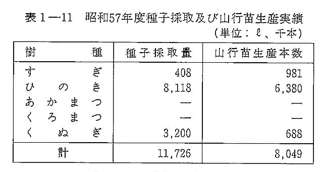 表1-11 昭和57年度種子採取及び山行苗生産実績 |