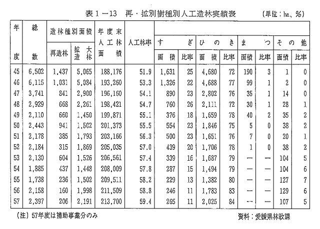 樹種別造林実績の割合は、昭和三三年まで五〇%を占めていたすぎが、造林適地の減少等から年々減少し、マツは、マツくい虫被害が影響して植栽実績は皆無となっている。これに対して、ヒノキの割合が昭和五七年度八四%を占めるまでに増加し、しいたけ原木林としてクヌギ(その他)の造林実績も約五%を占めるまでに増加している(表1―13)。
