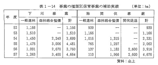戦後の拡大造林によって除間伐期を迎えた人工造林面積は一二万haにのぼり、この内緊急に間伐を必要とする森林は八万六、○○Ohaに達していることから、各種事業を活用して除間伐等保育事業の徹底を図っている(表1―14)。