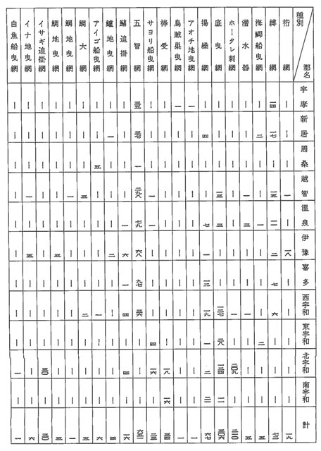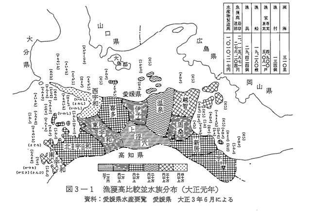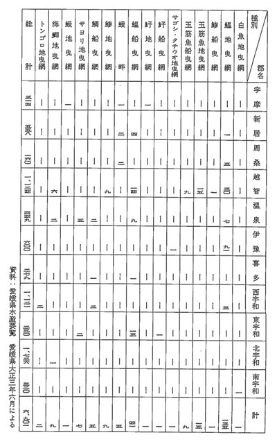五智網は六五一のうち越智郡が二九八と半数近くを占め断然多く、次いで伊予灘の喜多郡・温泉郡・伊予郡の順となっており、宇和海は西宇和郡の一部を除いてみられない。打瀬網は四〇三統のうち西宇和郡と北宇和郡で二三一統もあり、その五八%も占め断然多い。タイを目的とした縛網は、総数七二統のうち新居郡一七、越智郡一五、宇摩郡一四とタイの好漁場である燧灘に集中的に多く、次いで温泉郡一一、喜多郡七、西宇和郡六、伊予郡二となっており、瀬戸内海がタイ縛網の好漁場となって盛んであった。