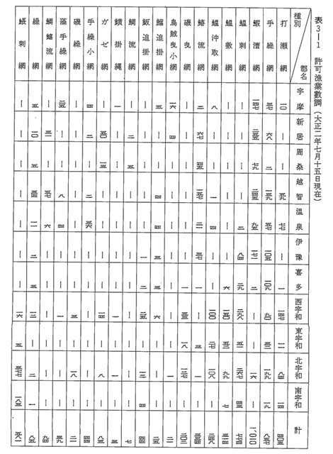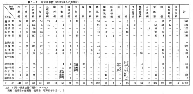 大正二年より約二〇年経過した昭和九年における県下の許可漁業数は表3-2に示したとおりであるが、総数においては半減し三、二〇九となった。この変動の要因は、手繰網が一五五と約五分の一に、五智網が二四一と約四割に激減したほか、鯛縛網や鰆流網の減少などもあるが、最も変動の大きかったのは鰮刺網・ホータレ刺網が殆どなくなったことである。そしてこの漁法に代わって新しくぼっ興したのは、南宇和郡・北宇和郡など宇和海における鰮揚繰網(七一)と西宇和郡・南宇和郡・喜多郡を中心とした巾着網漁業(五二)と、燧灘における文鎮漕(三三四)や越智郡・温泉郡・喜多郡・新居郡などの燧灘並びに伊予灘におけるたこつぼ漁業である。地域別にみると鰮刺網などの多かった北宇和郡・西宇和郡・南宇和郡など宇和海地域の激減が目立つほか、越智郡の五智網、鰆流網などの減少が著しい。