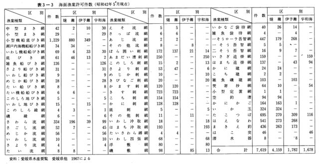昭和四二年現在の知事許可漁業総数は、表3-3のとおり七、六一九件であり、昭和九年の三、二〇九件に比べ約二倍半に増加した。この増加の要因はえび漕網・たこつぼ漁業・まき餌釣りが増加したほか、新たにきす刺網・はえなわ・一そうローラー五智網・いか玉漁業・ぼら囲刺網・瀬戸内海機船船びき網・こち刺網・いさぎ追掛網・あまだい漕刺網などが許可漁業として加わったことによる。これを海域別にみると、燧灘四、一五九(五五%)、伊予灘一、七八二(二三%)、宇和海一、六七八(二二%)となっている。