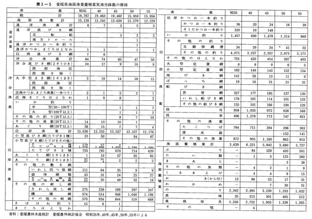 漁労体数の変遷経過については、三の経営体の動向に準じた動きをみせているが、特に浅海養殖の発達により本県漁業の様態を一変したといわれる昭和三五年より五五年までの五か年毎の推移を表3-5に揚げた。この主な動きをみると、①以西機船底びき網が四五年次にはなくなっているが、これは岩切水産他が根拠地の他県への変更により本県分の調査対象から除かれたことによる。②沖合底びき網の減少は昭和二八年以降の減船整理による。③大中型まき網の増加は御荘町中浦・三瓶・戸島・日振島などにおける技術、資本、経営能力の優位性による。④一そうまき網が増加し、二そうまき網といわし四つ張網の減少はそれぞれ相関関係があり、魚群探知機の普及に伴い、一そうまき網の方が生産経費が節減され、省力化の点でも優れているためである。⑤磯建網の増加は漁具のナイロン化による漁場の沖合化と漁獲効率の向上による。⑥さばはねつりの減少は大中型、中型まき網との競合もあり採算に合わなくなった。⑦漁獲効率の悪い地びき網の減少は高能率なまき網や船びき網の増加に反比例して減少した。⑧ローラー五智網の減少はタイ資源の減少ないし横ばい傾向のため単位漁獲努力当たり漁獲量の減少による。⑨採貝の減少は漁場の埋め立て、環境悪化によるあさり、ばか貝の資源量の減少による。⑩釣り漁業の減少は他の沿岸漁業との競合関係や従事者の高齢化による労働力の漸減などによる。
