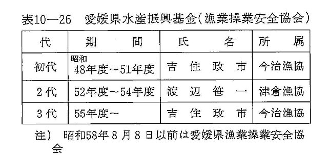 昭和五八年八月八日漁業操業安全協会の名称を愛媛県水産振興基金に改め、従前の操業安全協会の事業のほかに新たに水産業振興対策事業を実施することとなった。