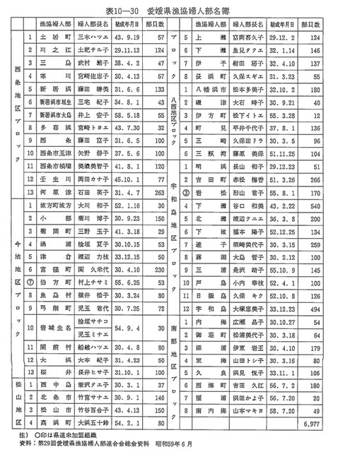 漁業協同組合への協力組織として婦人部活動を通じ「漁村婦人部相互の連帯を深め漁村帰人の文化の向上と漁家経済の安定を図り、豊かな漁村を築くこと」を目的として結成されたもので、県下では昭和二九年一一月川之江漁協婦人部の結成が最初である。年代別の結成状況をみると昭和二〇年代は川之江、上灘、明浜の三婦人部、三〇年代は三四婦人部、四〇年代は七婦人部、五〇年代は一六婦人部となっている。昭和五八年度現在東予地区は二六婦人部、中予地区は一二婦人部、南予地区は二二婦人部の計六〇婦人部が結成され漁協婦人部活動が活発に行なわれている。県下総体の結成率は約七〇%であるが、このうち南予地区は一〇〇%結成されている。