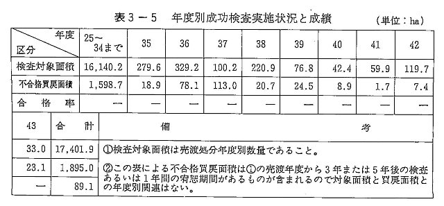 昭和二五年度から昭和四三年度までの検査実施面積(未墾地売り渡しの面積)と、その成績は表3-5のとおりである。