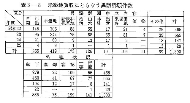 第一回未墾地買収から、ようやく買収の大半が終わった第一一回買収(昭二五)までの異議訴願の申し立て状況と処理内容は表3-8のとおり一、三〇〇件に及んだ。