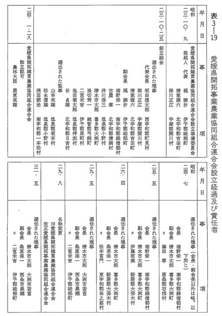 同年一〇月二五日、二七の開拓農協代表で創立総会を開き、直ちに農林大臣に設立認可申請を行ない、昭和二四年一月二八日付けで農林大臣周東英雄より設立認可指令が交付され、いわゆる県開連が発足し、昭和四八年二月一日、解散議決の認可が農林大臣桜内義雄より下りるまで組織活動を行なった。その間、実に二四年間、対県・対政府折衝など、本県開拓者の代表機関として獅子奮迅の活躍をした。その責任者などは表3-19のとおりである。