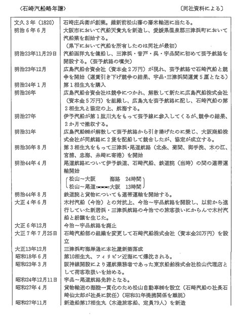 石崎汽船株式会社はマルイチの屋号とシリーズ船相生丸の名で、愛媛県民特に中予地区の人々に親しまれてきた。略年譜に示すとおり、創業は遠く文政三年(一八二〇)にさかのぼる。(○まるの中に一)の旗をひるがえした帆船は瀬戸内・関西のみならず関東・東北・北海道の各港にまで出入りしたという(最初の汽船と伝えられる外輪船の天貴丸については詳細を知り得る資料がないのが残念である)。以来、中・四間航路を中心に旅客輸送を営み、鉄道の登場、西への延伸に対応していも早く連帯運輸体制を確立するなど時代の進運によく適合してきた。一方、松山を中心とする短距離航路という性質上、需要が旺盛な半面競争が激しく、老舗をほこる石崎汽船も苛烈な競争に直面せざるを得なかった。同社の明治二〇年(一八八七)代以降の歴史は、競争と協定の繰り返しであったといえる。