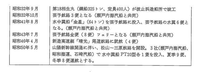 山陽新幹線の開通、松山空港のジェット化など昭和四〇年代後半からの旅客流動体系の変化は目まぐるしく、これら高速交通手段への海上からの対応は必ずしも容易ではないが、それが同社にとってもわれわれ利用者にとっても極めて重要な意味をもつことはいうまでもない。