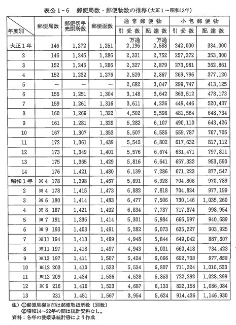 次に大正元年から昭和一三年の間の県内郵便局数・取扱郵便物数の推移(表公1-6)を見ることにする。通常郵便物引受数は、明治三七年(一九〇四)一、二七七万通と一、〇〇〇万通を超したが、大正元年(明治四五年)には、二、一九六万通、同六年(一九一七)三、一四八万通、八年四、五〇二万通、九年五、二八二万通と着実に増大し、昭和二年には六、八八二万通と第二次世界大戦前のピークに達した。なおこれを県内人口一人当たり引受数で見ると、大正元年二〇・三通、大正四年二二・八通、同九年五〇・三通、同一四年五五・八通と大きく増加しており、大正期に郵便が県民生活の中に広く普及したことが分かる。