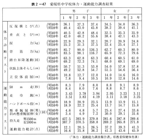 このように体力づくりが重視された背景には、昭和三八年の東京オリンピック開催による国民の体育・スポーツへの急激な関心の高まり、同四一年の「青少年の健康と体力」という体力自書によって明らかにされた児童生徒の体力低下現象、国際競技大会での躍進を期待するスポーツからの要請、更には、高度経済成長期の豊かな労働力への要求などを反映したものであった。ともかく、昭和四〇年代の体育は体力づくりが際立って強調された時期であった。