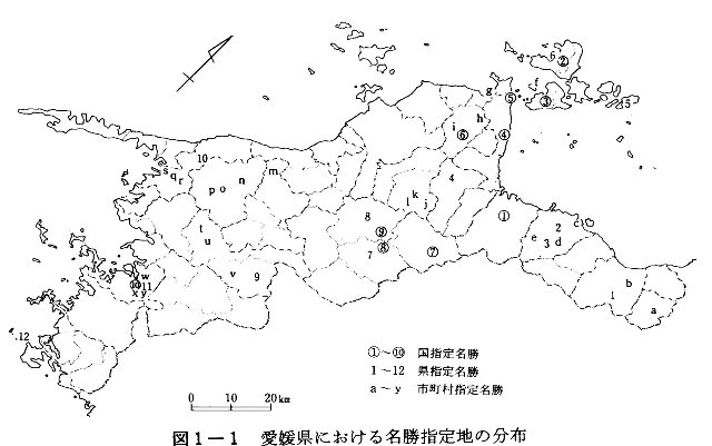 国・県指定の名勝は東予に多く、両者で一一件、南予には市町村指定のものが多くて一三件ある。以下、東予から名勝地を列挙してあるが、頭につけた記号は、図1―1の記号にあわせてある。
