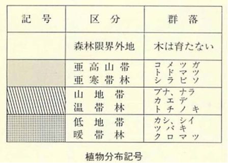 本郡の植物垂直分布は、低地帯、すなわち常緑広葉樹帯から、亜高山帯、すなわち、針葉樹帯に及んでいる。水平分布では、暖帯から、温帯性のものが見られる。