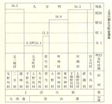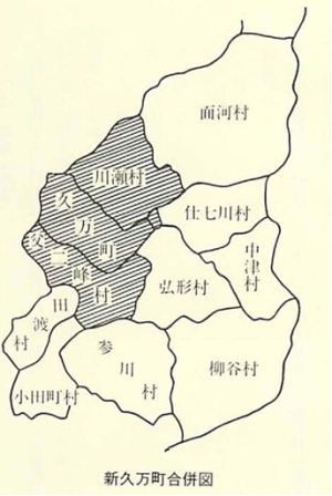 こうして、藩政時代一三の小村が、明治二二年の町村制施行により五か村となり、更に大正一三年には四か村、昭和一八年には三か村としだいに合併してその区域を拡大し、昭和三四年三月三一日、人口一万五三一三人を有する久万町となって、輝かしい第一歩をふみ出したのである。