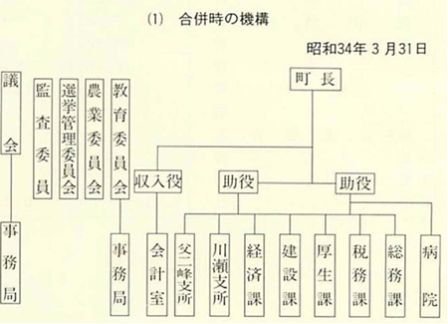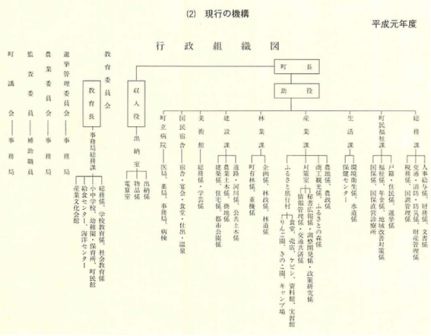 昭和五一年 四月 一日 「企画調整室」を「企画課」に、「福祉課」と「町民課」を統合して「町民福祉課」に、「環境課」を生活課」にそれぞれ改め、「国土調査課」を廃止する。(本庁七課一室)