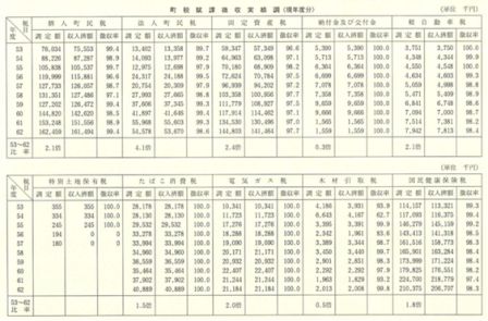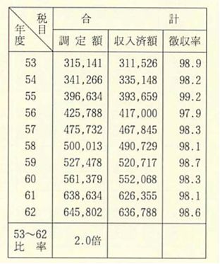 一〇年間の平均数値をみると、普通会計歳入決算額は三一億七七〇〇万円で、このうち町税収入済額は三億一八〇〇万円を示し、その占める割合は一〇・〇二%である。普通会計のうち、その一割前後が町税収入という傾向を示している。
