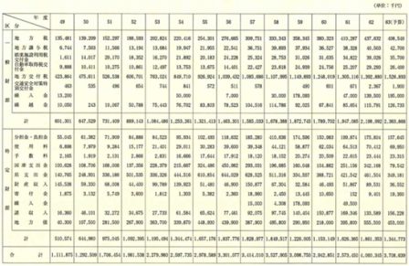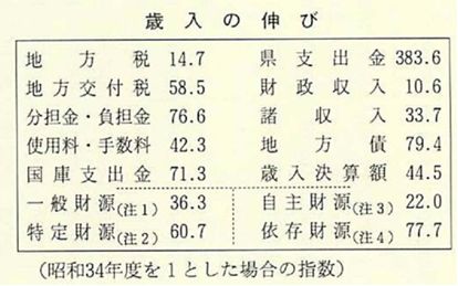 普通会計歳入決算額を三〇年間の伸びで表わすと次表のとおりである。これらの表を見ると、国・県支出金、地方債、分担金、負担金等特定財源の伸び(六〇・七)が大きいのに対し、地方税、地方交付税等一般財源の伸び(三六・三)が小さいことがわかる。特に、一般財源の内地方税の伸び(一四・七)が少ない。また、歳入決算額の構成比で見ると、合併当初は地方税、財産収入の占める割合がかなり高くなっているが、徐々に減少し、かわって地方交付税、県支出金、地方債の占める割合が高くなってきた。