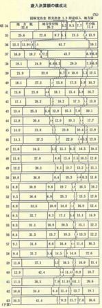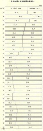 自主財源が多いということは、財政基盤に安定性があるということであるが、この表を見るとその変動が顕著である。合併当初は自主財源の割合も、五九・六%から八四%とかなり高かったが以降次第に減少し、四〇年代前半には五〇%を割ることとなった。自主財源の主なものは、地方税と財産収入(町有林会計から繰入)である。特に合併当初が高いのは、庁舎建設等の財源として町有林会計の繰入れが多かったためである。