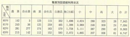 昭和六三年度のグループ数及び会員数は二七グループ、二九一名である。昭和六二年二月現在の蔵書数は二万二八六〇冊。昭和六二年度図書館利用者総数は九〇六三名。昭和六二年度利用総冊数は一万六三二六冊である。
