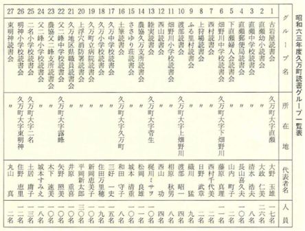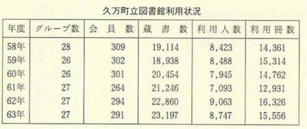 昭和四四年度から、図書館の機能を拡充させるために、直瀬小学校、二名小学校、久万町役場の三か所に配本所を設置した。同年の読書グループ数は三五グループ、その中でも特に中野村の「睦実会」(代表 山崎民衛)「東明神読書会」(代表 正岡チヨ子)「新狩場読書グループ」(代表 佐伯宗繁)等が熱心であった。