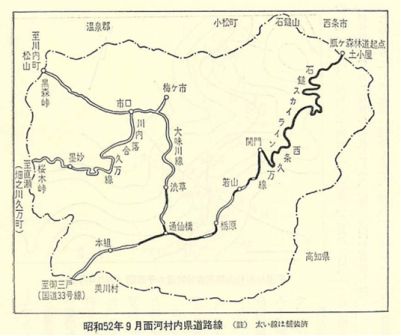 以上、久万若山線(西条久方線)の県道誘致運動、並びにその維持改修などについて、先哲のなみなみならぬ努力の跡を述べてきた。今や、この路線は、本村交通の大動脈のみならず、石鎚スカイライン・瓶ヶ森林道の開通と併せ、面河の観光ルートとして、広く県内外に脚光を浴びている。