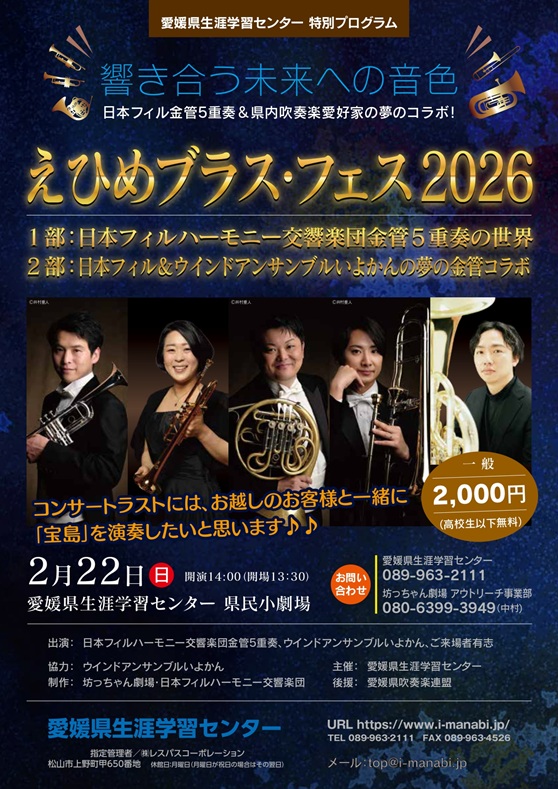 本年は、音楽の部門の開催として日本フィル金管五重奏をお招きし、『響き合う未来への音色えひめブラス・フェス2026』を開催いたします。