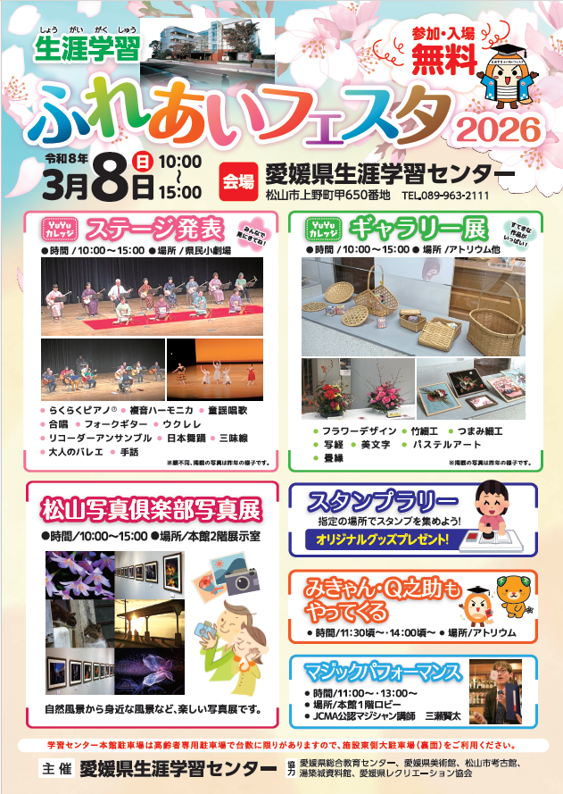 2025年度 愛媛県生涯学習センターで実施した講座の 成果発表として、ステージ発表や作品展示を行います。 他にも、工作など体験コーナーを予定しています。是非ご来館ください。