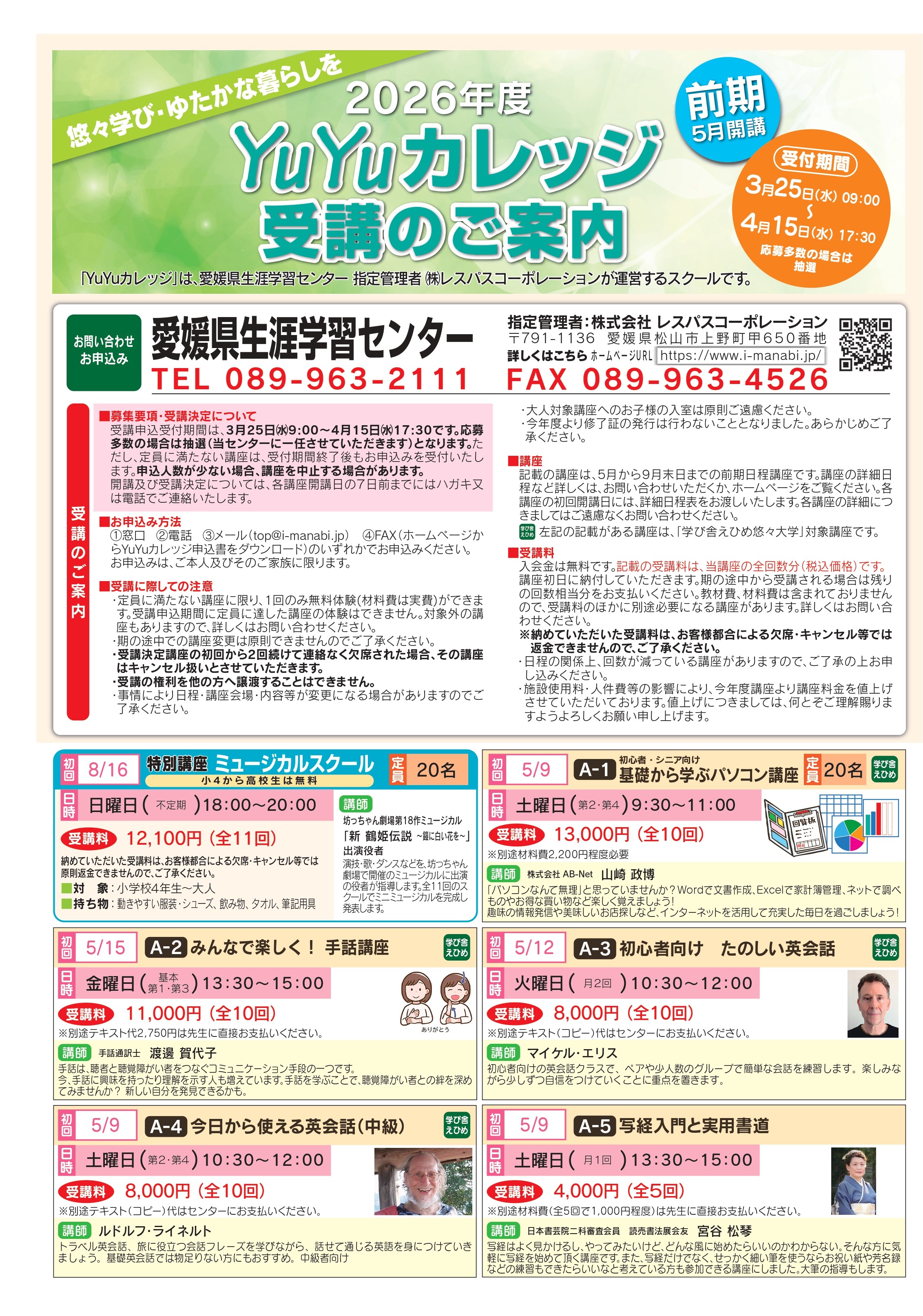 YuYuカレッジは、愛媛県生涯学習センター 指定管理者株式会社レスパスコーポレーションが運営するスクールです。