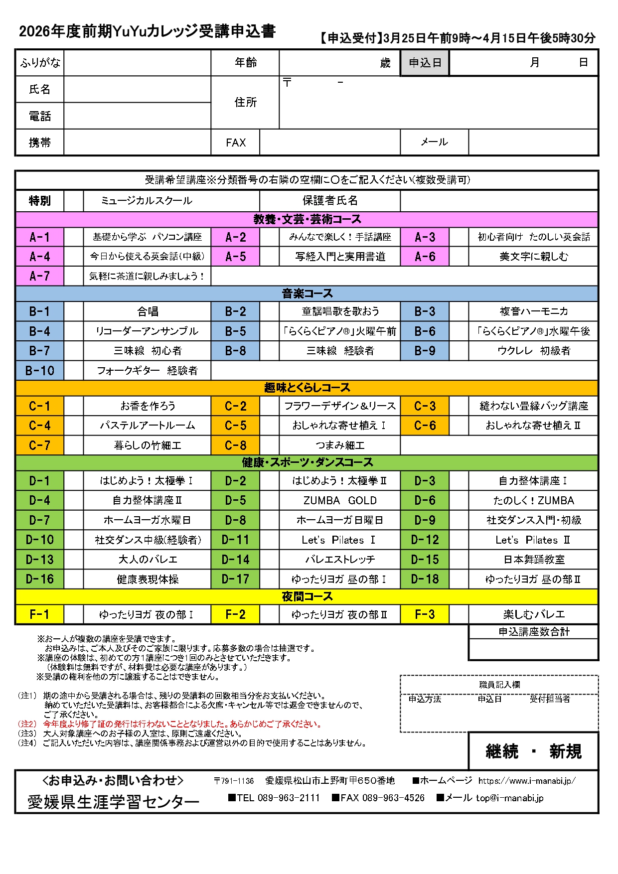 定員に満たない講座は申し込み期間終了後もお申し込みを受付いたします。