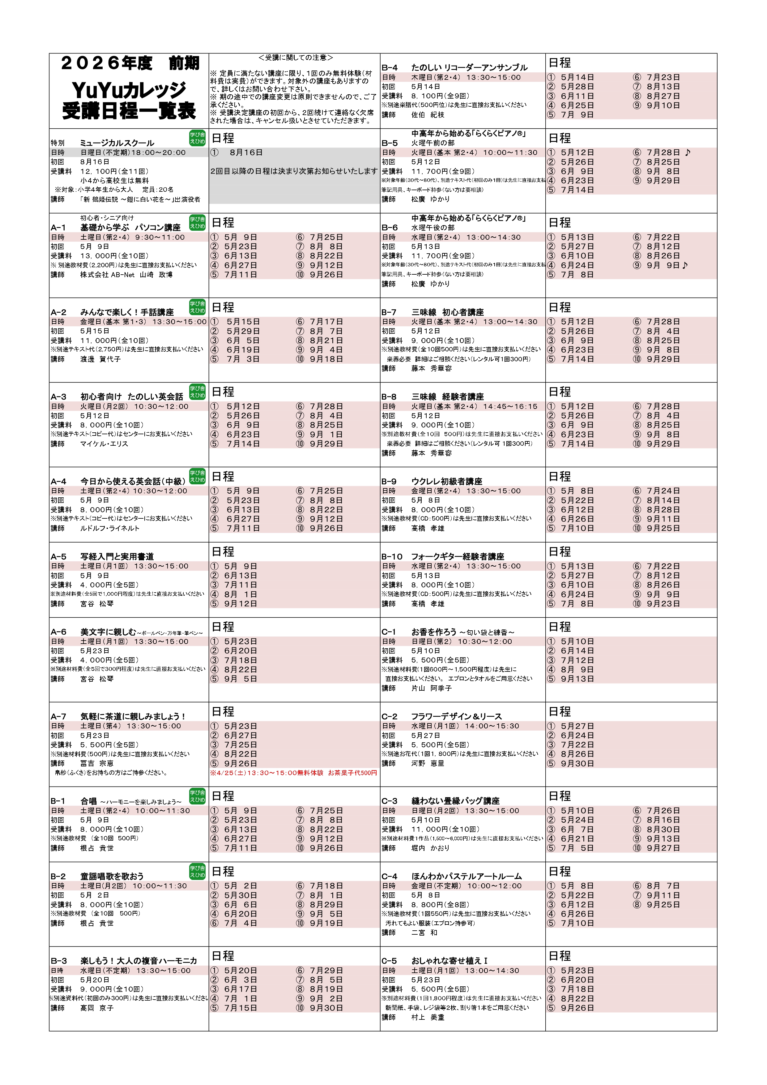 開講日程表から変更のある講座がございます。